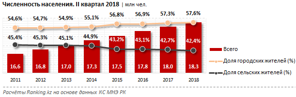 По итогам первого полугодия в РК в городах проживает 10,5 миллиона человек - на 4 процента больше, чем годом ранее. Это уже 57,6 процента от всего населения РК против 57,3 процента год назад и всего 54,6 процента в 2011 году, до принятия Прогнозной схемы.
