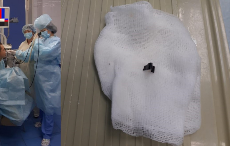 "Произошли грануляция и загноение, в результате началась гнойная пневмония. Пациент мог лишиться части легкого, но врачам алматинской БСНП удалось извлечь с помощью эндоскопической операции инородный предмет, причем без каких-либо последствий. Размер скрепки был 6 на 5 миллиметров, достаточно большой", - рассказала подробности операции доктор медицинских наук, врач-бронхолог отделения эндоскопии больницы Лариса Пюрова.