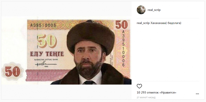 Рэпер оценил мем, в котором Николас Кейдж в чапане изображен на казахстанской купюре старого образца.