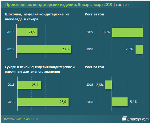 За I квартал казахстанские кондитеры произвели 21,5 тысячи тонн кондитерских изделий из шоколада - на 9,8 процента меньше, чем годом ранее. Производство мучных кондитерских изделий длительного хранения также сократилось: на 2,3 процента за год, до 25,4 тысячи тонн.