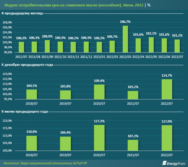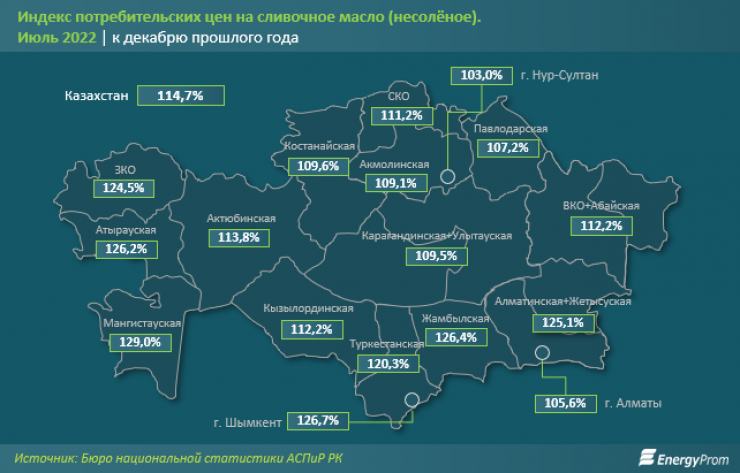 Средняя по стране розничная стоимость несоленого сливочного масла в июле текущего года достигла 3,3 тысячи тенге за килограмм. В разрезе крупных городов цена варьировалась от 2,7 тысячи тенге в Павлодаре до 4,3 тысячи тенге в Атырау.
