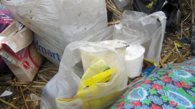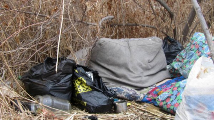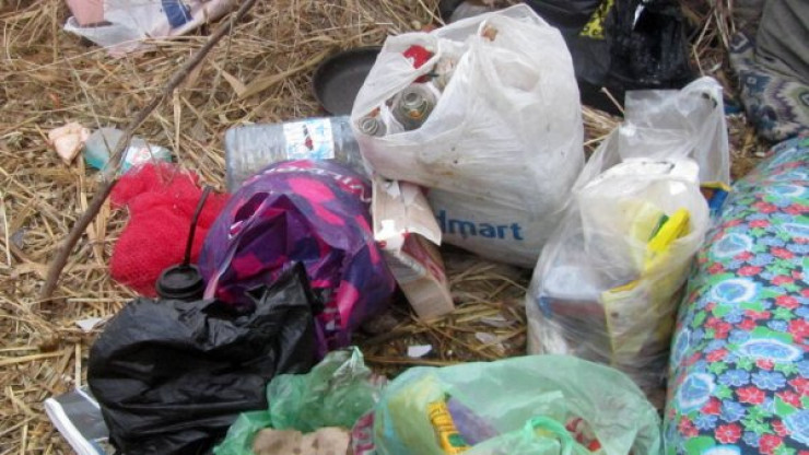 В кустах лежит одеяло, напоминающее спальный мешок, две подушки и сумка с вещами. Рядом находятся пакеты с продуктами, картошкой, луком. Здесь же упаковки с остатками макарон, овсяных хлопьев, сметаны и других продуктов. Много пустых пивных бутылок и банок из-под еды.