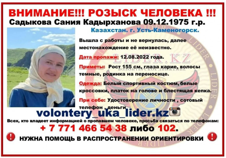 Всех, кто хоть что-то знает о женщине или обстоятельствах ее пропажи, просят позвонить по телефонам +7 771 466 54 38 или 102.