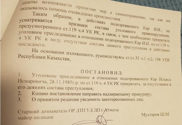 Сестра погибшей добавила, что статью 119 УК РК "Оставление в опасности" следователь не вменил Ильясу Кару.