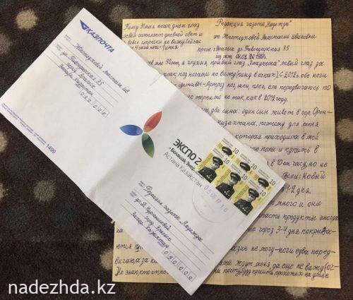 Я глухая, правый глаз (глаукома), левый глаз (хрусталик). Под ногами ничего не вижу, пишу в очках. С 2012 года суставы обеих ног начали страшно ломить. Еле передвигаюсь по дому. Родных у меня в Уральске нет. Есть два сына: один живет в Оренбурге, второй - в северном Казахстане, поэтому в 2009 году мне от горсобеса выделили работницу, которая приходит ко мне домой два раза в неделю, чтобы помыть полы и купить в магазине продукты. Но не всегда получается, чтобы она приходила помогать вовремя. Сейчас стало много государственных праздников, и они зачастую длятся по 7-10 дней. На это время я должна запастись продуктами. Особенно хлеб и батоны уже через 3-4 дня покрываются плесенью. Сама сходить в магазин я не могу, еле ноги передвигаю. За калиткой все бугры и ямы ждут меня, да еще и не вижу. Не знаю, кто отнесет мое письмо на почту. Возможно, буду просить прохожих на улице.