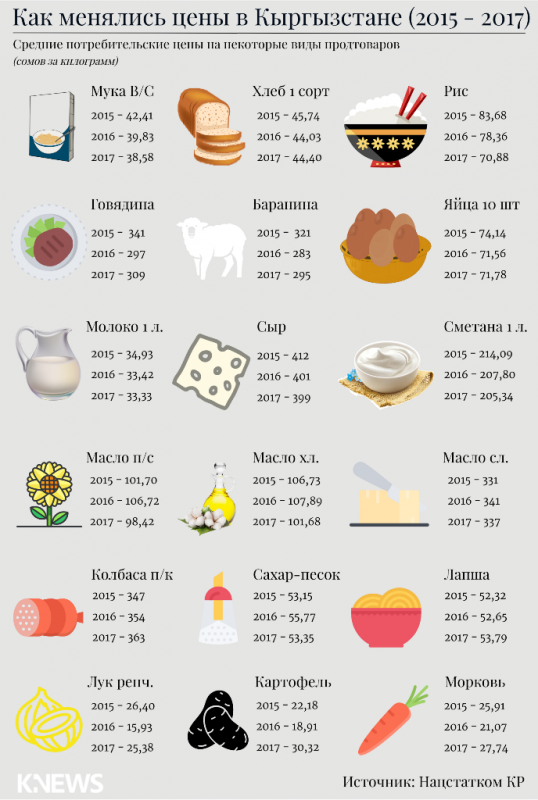 Специалисты статкомитета Кыргызстана отмечают, что наибольшее влияние на динамику инфляционных процессов в республике оказывает изменение цен на пищевые продукты и безалкогольные напитки.