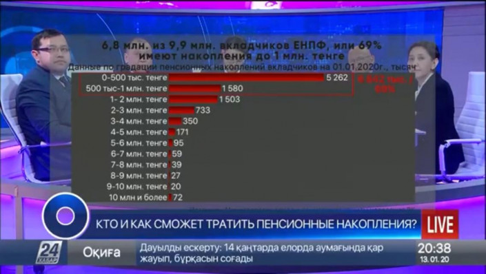 "Таким образом, по нашим расчетам, работающих граждан - порядка 113 тысяч человек и достигших пенсионного возраста - порядка 120 тысяч человек, которые могли бы этим (снятием денег с пенсионного счета. - Прим.) воспользоваться.  Мы предлагаем использовать их для покупки жилья, лечения, а также по выбору он может перевести эту часть пенсионных накоплений в частную компанию по управлению пенсионными активами для наращивания своих (накоплений. - Прим.)", - уточнил Нурымбетов.