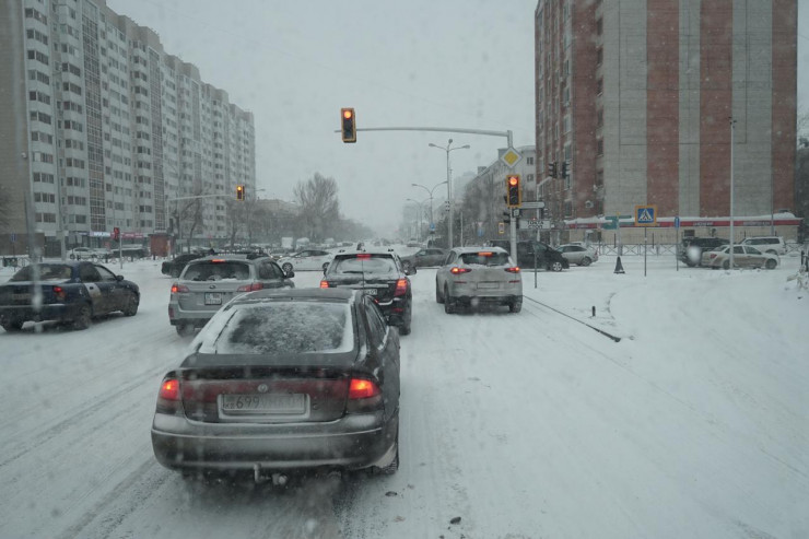 В городе также образовались пробки. Обильный снегопад заставляет водителей ехать медленно.