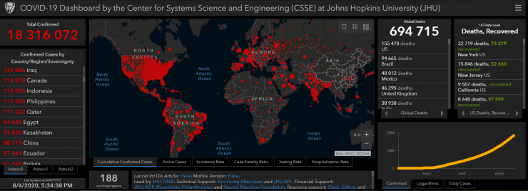 На сегодня обновленных данных по Казахстану нет ни на сайте ВОЗ, ни на сайте Университета Джонса Хопкинса, который также ведет мировую статистику и расположил нашу страну на 28-м месте в антирейтинге по числу заражений в 188 странах.