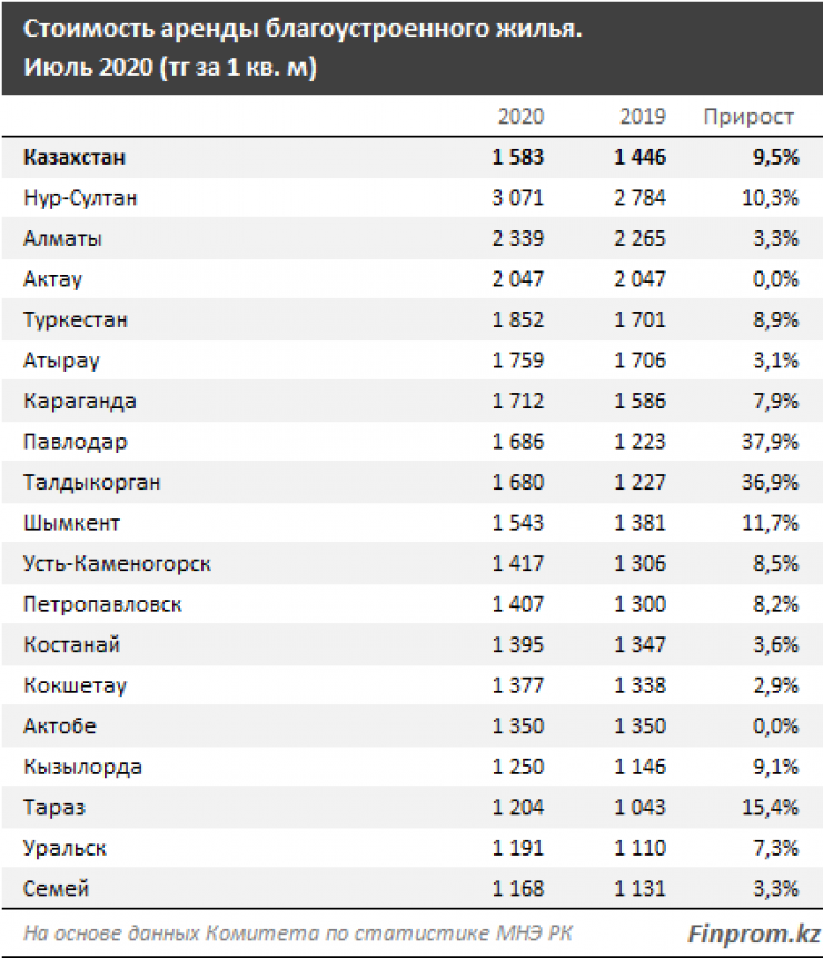 Среди крупных городов страны самые высокие средние цены на аренду благоустроенного жилья зафиксированы в Нур-Султане: 3,1 тысячи тенге за квадратный метр. Это на 10,3 процента больше, чем годом ранее. В тройку крупных городов с самыми высокими ценами также вошли Алматы и Актау.