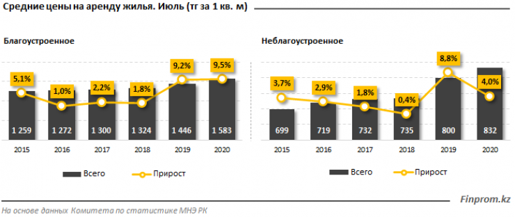 Сообщается, что в июле средняя цена аренды благоустроенного жилья в стране составила 1,6 тысячи тенге за квадратный метр - на 9,5 процента больше, чем годом ранее. По сравнению с июнем стоимость аренды благоустроенного жилья выросла на 0,4 процента.
