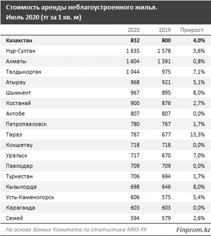 Средняя стоимость аренды неблагоустроенного жилья составила 832 тенге за квадратный метр, это на четыре процента дороже, чем годом ранее. По сравнению с июнем текущего года стоимость аренды осталась неизменной.
