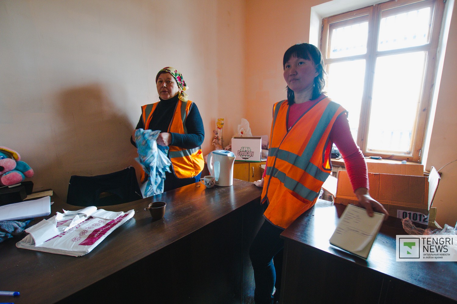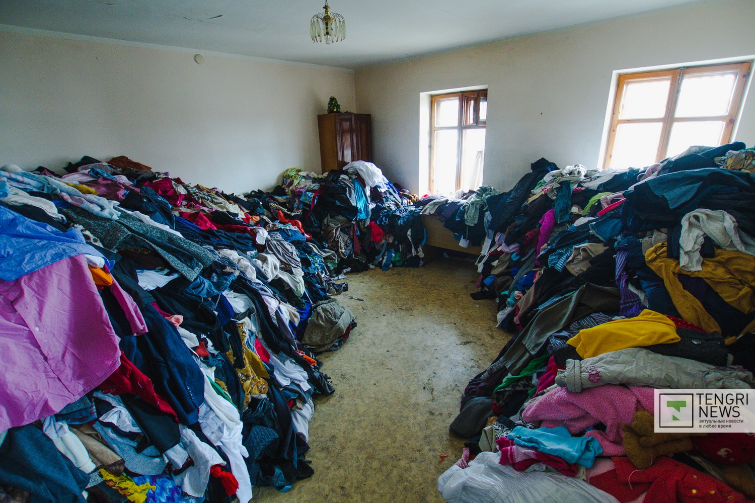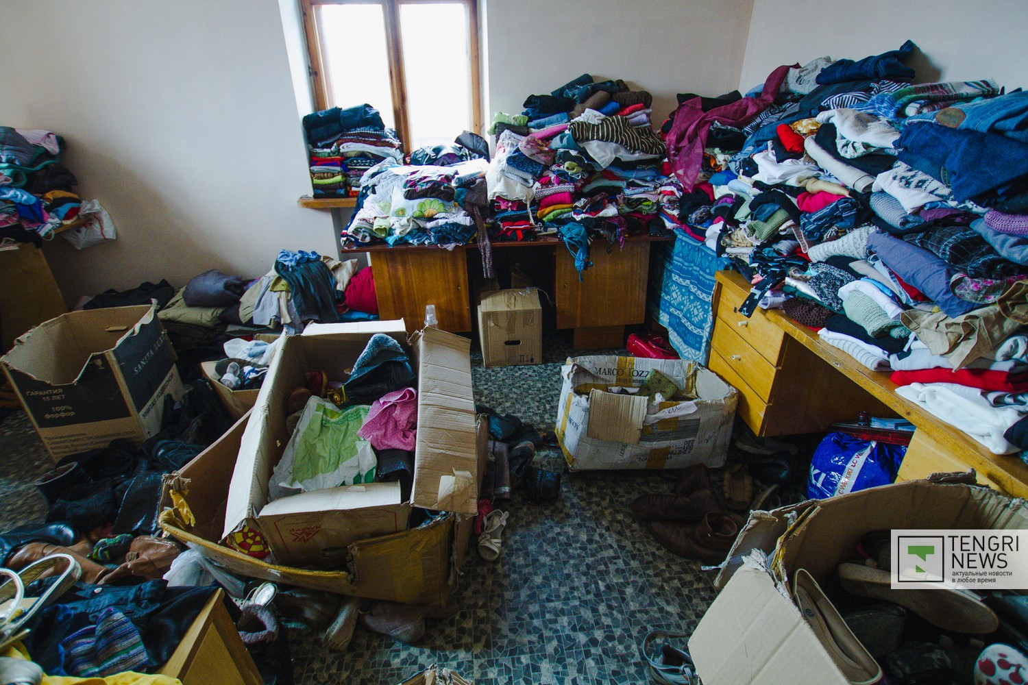 В этом кабинете несколько женщин-волонтеров, приехавших из соседних районов, перебирают всю доставленную одежду и обувь: все детское отдельно от женского и мужского. Здесь сотни килограммов самых разных вещей: как на лето, так и на зимнее время года. Женщины, сортирующие их, говорят, что среди вещей есть абсолютно новые с этикетками. Была даже женская шуба из ценного меха.