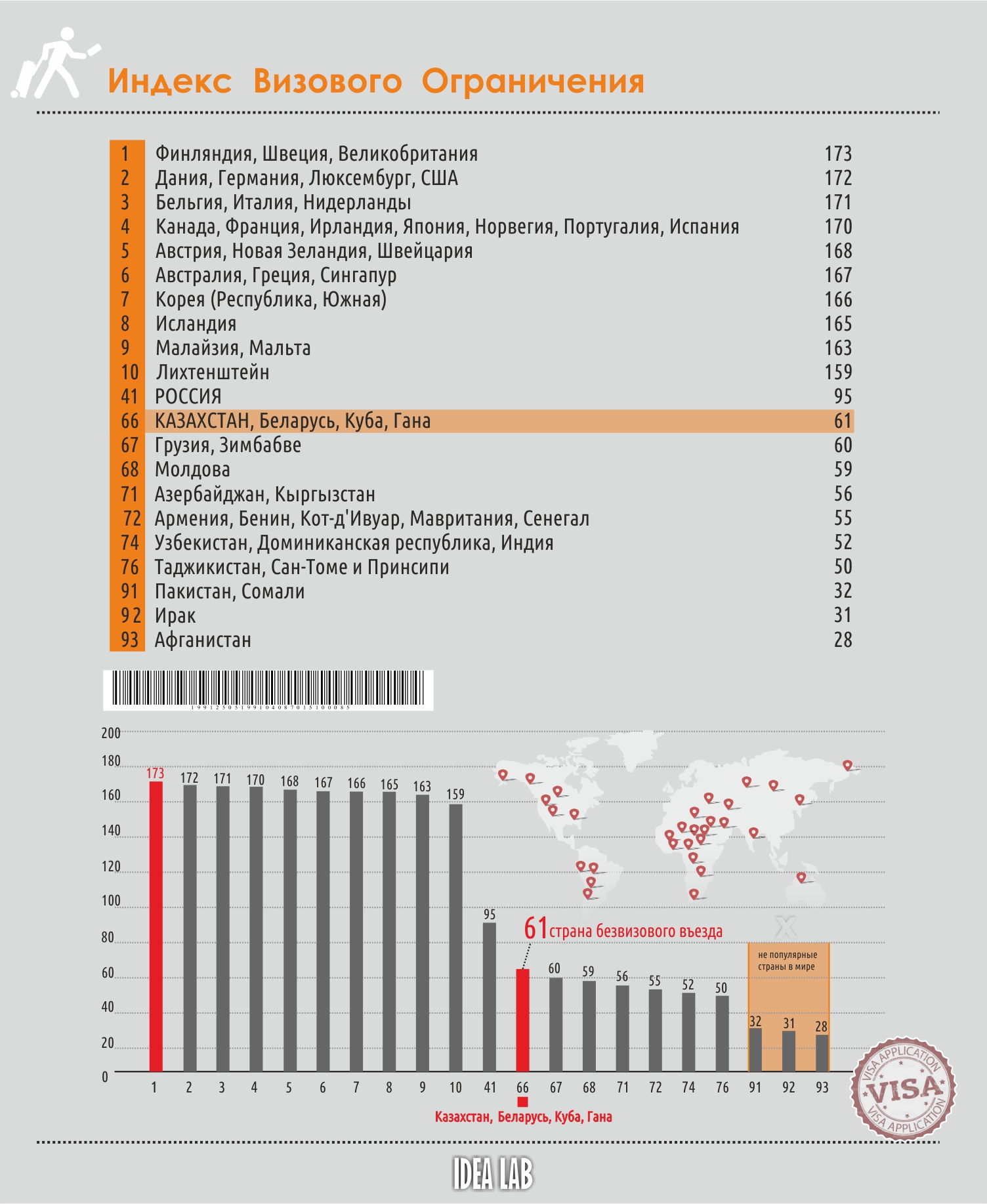Больше всего свободы дают паспорта почти всех европейских стран, особенно Великобритании, Финляндии, Швеции, Дании, Германии, Бельгии, Италии и Нидерландов. Граждане этих стран могут свободно въезжать на территорию более чем 170 государств. С другой стороны, наиболее закрытыми оказались Пакистан, Сомали, Ирак и Афганистан. Эти страны имеют безвизовый режим с 25-30 государствами и отнесены к списку "непопулярных".