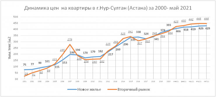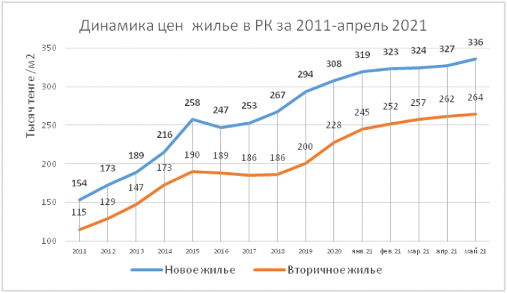Однако бурный рост ипотечного кредитования вызвал рост не только объемов строительства, но и рост цен на жилье. Динамика цен с 2011 года по май 2021 года в среднем по Казахстану (данные Национального бюро статистики) показывает, что за 11 лет новое жилье подорожало со 154 до 336 тысяч тенге за квадратный метр, то есть более чем в 2,2 раза.