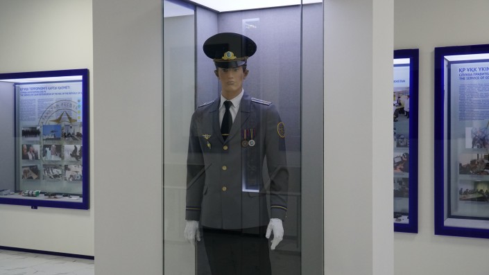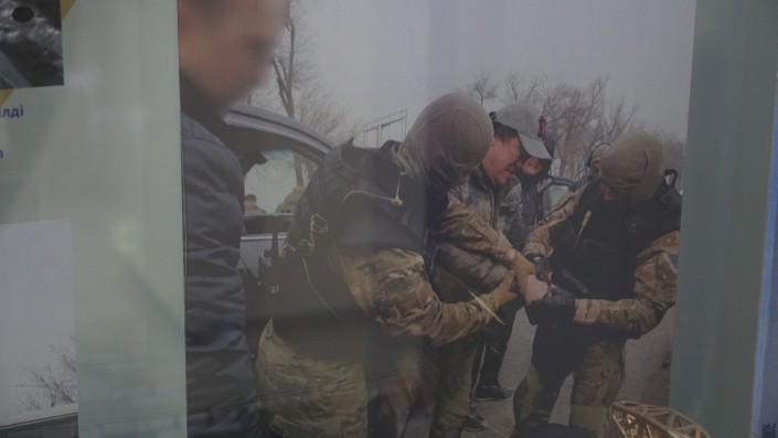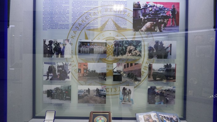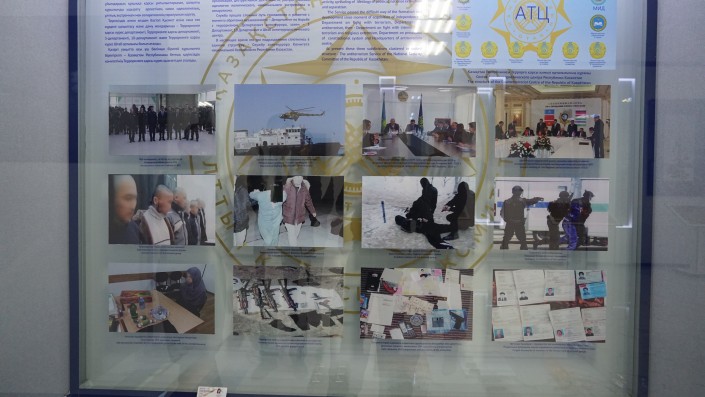 "Вот вы видите, на фото в первом ряду идет процесс подготовки учений по антитеррористической деятельности. Второй ряд - на снимках показан процесс задержания террористов. Вот группа террористов задержана: это гражданин РК, экстрадируется за террористическую деятельность из другой страны", - рассказывает сотрудник музея.