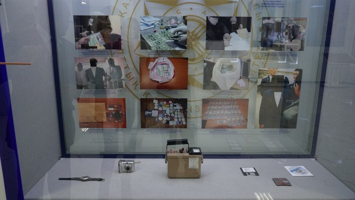 В самом большом из трех залов установлено несколько стеклянных стендов. На них фотографии, предметы, рассказывающие о работе отдельных подразделений КНБ. Одна из них - служба контрразведки. На отдельных снимках разного периода фрагменты конкретных спецопераций.