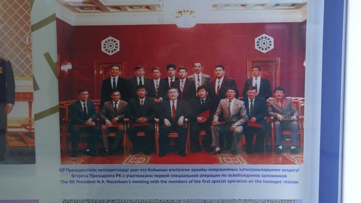 На фото ниже запечатлена встреча Нурсултана Назарбаева с участниками первой в Казахстане спецоперации "Набат" по освобождению заложников. В конце февраля 1992 года шестеро приговоренных к высшей мере наказания, напав на караульных, бежали с этапа Москва - Ташкент. Преступники захватили рейсовый автобус с пассажирами, следовавший по маршруту Кызылорда - Сарыагач. Бандиты требовали транспортный самолет и деньги. Освобождение заложников провели бойцы группы "Альфа" КГБ СССР. После успешно проведенной спецоперации независимый Казахстан создал собственное подразделение "А" - "Арыстан".