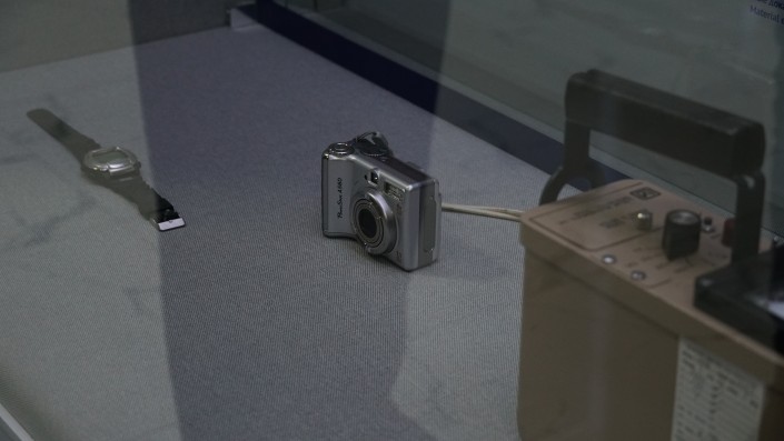 "Фотоаппарат изъяли у разведчика, с него велась скрытая съемка. Вот простые наручные часы, а в них было записывающее устройство. Следующий предмет - он двойного назначения. Работает как аккумулятор, и в то же время разведчиками использовался как измерительный прибор. На дисках хранилась информация", - поясняет Талгат Калитов.