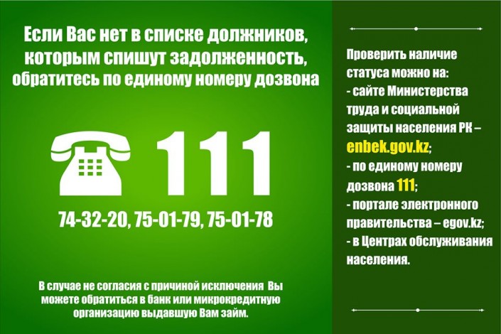 Граждане не читают информацию из официальных источников, а начинают передавать друг другу из уст в уста и создавать ажиотаж. В один момент даже был слух о том, что у попавших в список испортится кредитная история. На самом деле это не так. Никого не будут заносить в черные списки в банках. Это все в правилах списания прописано", - прокомментировал пресс-секретарь Министерства труда и социальной защиты населения РК Александр Кононец.