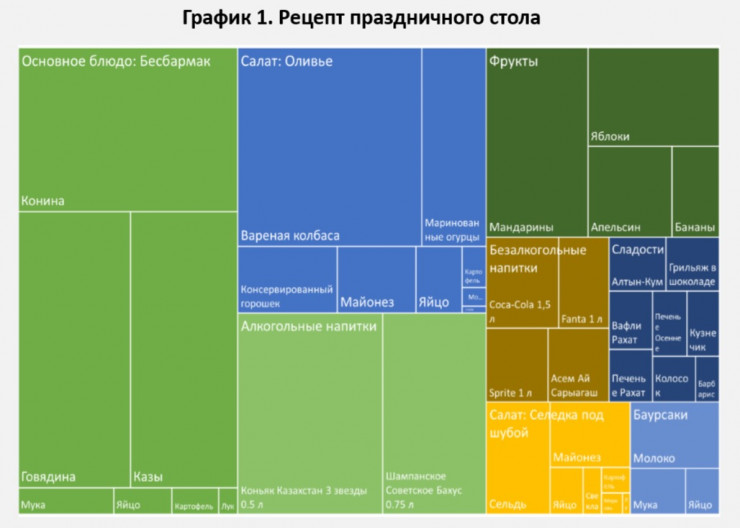 "В преддверии Нового года была сделана оценка стоимости новогоднего стола на базе данных, собранных системой Galymzhan. Таким образом, в выборку были включены города, имеющиеся в системе, а новогоднее меню составлено экспертно. Стоимость новогоднего стола рассчитывалась с учетом среднего количества человек в домохозяйстве по Казахстану - четыре человека", - говорится в докладе Национального банка о денежно-кредитной политике Казахстана за 2020 год.