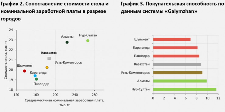 "Самая высокая покупательская способность наблюдается в Нур-Султане (11,54 стола), самая низкая - в Шымкенте (6,73 стола). Стоит отметить, что в Усть-Каменогорске при среднемесячной номинальной заработной плате ниже среднего значения по республике жители города могут позволить себе накрыть 9,44 новогоднего стола, что превышает среднее значение рассчитанного индекса по стране", - отметили специалисты Нацбанка.