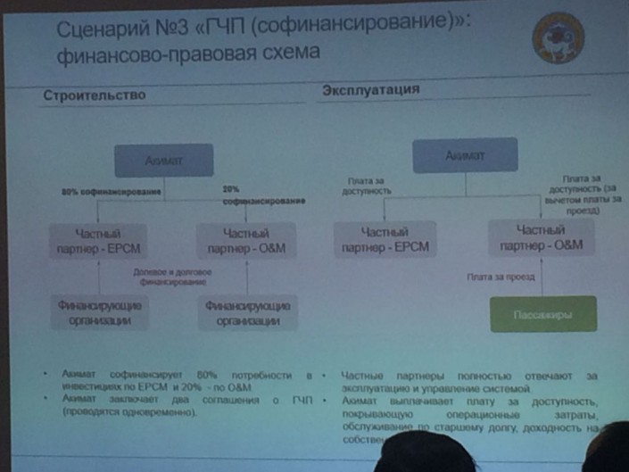 В свою очередь заместитель руководителя Управления пассажирского транспорта и автомобильных дорог Алматы Талгат Хосчанов рассказал о том, что конкретно рассматриваются два типа договоров ГЧП: ЕРСМ контракт, по которому акимат софинансирует 80 процентов потребности в инвестициях, и Q&M контракт, где софинансирование акимата предполагает 20 процентов.