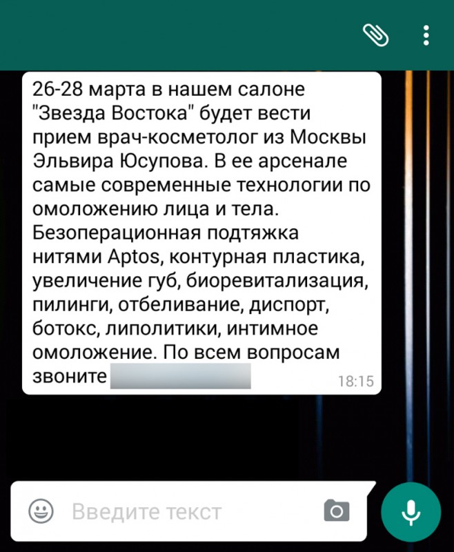 Однако позже стало известно, что администрация салона красоты делала рассылку на мессенджер WhatsApp, в которой говорится, что с 26 по 28 марта в салоне красоты "Звезда Востока" будет принимать врач-косметолог из Москвы Эльвира Юсупова. Далее идет перечень оказываемых ею услуг, а в конце сообщения указан номер телефона.