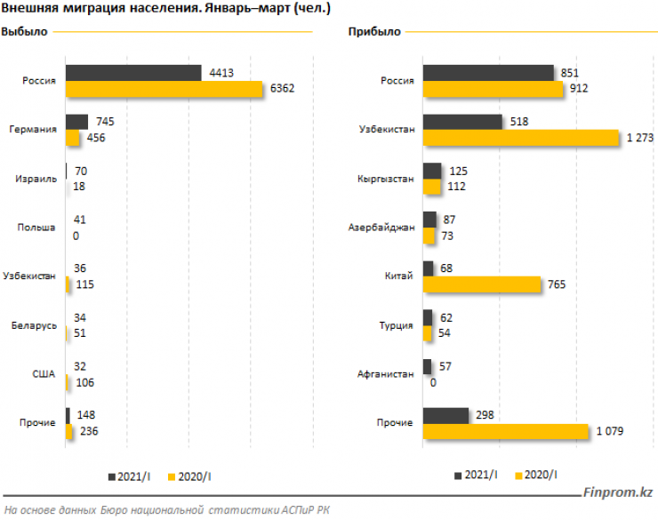 Уезжают из Казахстана в основном в Россию, Германию и Израиль, приезжают - из России, Узбекистана и Кыргызстана.