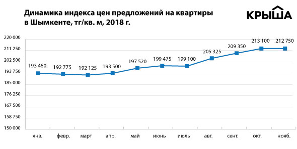 Наибольшее снижение стоимости предложений в ноябре отмечено в Шымкенте. Индекс снизился на 0,6 процента (1 408 тенге) и составил 212,8 тысячи тенге за квадратный метр. Такая динамика наблюдается впервые за второе полугодие, и вряд ли она окажется устойчивой.
