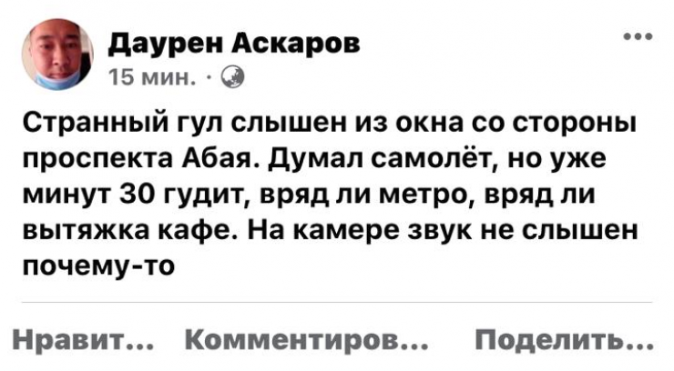 "Гул слышен из окна со стороны проспекта Абая. Думал, самолет, но уже 30 минут гудит. Вряд ли метро, вряд ли вытяжка кафе", - написал один из пользователей.