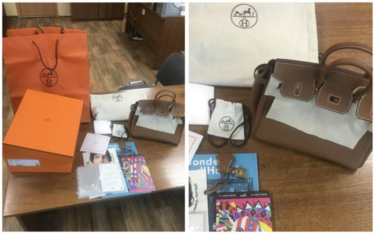 "Сумка женская Hermes коричневого цвета, коробка оранжевого цвета с надписью Hermes с содержимым документов от сумки, пакет оранжевого цвета, буклеты Hermes в количестве 4 штук. Оценочная стоимость - 8 542 454 тенге", - говорится в описании лота.