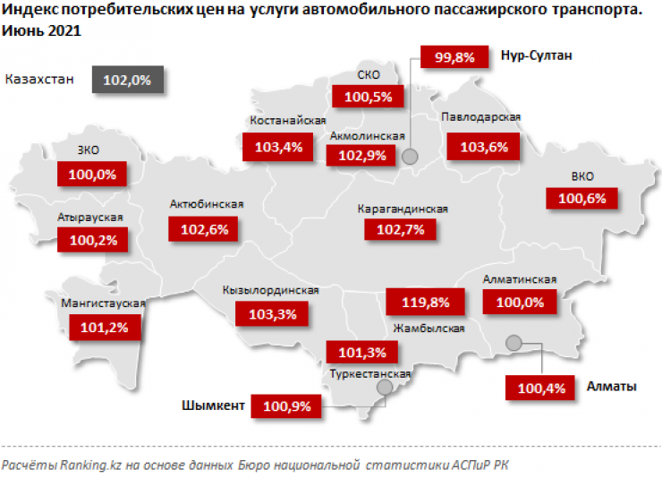 По итогам июня 2021 года цены на услуги автомобильного пассажирского транспорта в стране выросли на два процента за год. Сильнее всего ощутили рост цен жители Жамбылской области, где тарифы увеличились на ощутимые 19,8 процента.