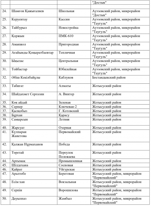 Ранее аким Алматы Бауыржан Байбек сообщил, что из трех тысяч алматинских улиц одинаковые названия имеют 250. Две сотни улиц - безымянные. По его словам, в городе есть 13 улиц Абая, 12 улиц Жамбыла. Даже район Алгабас пять раз повторяется.
