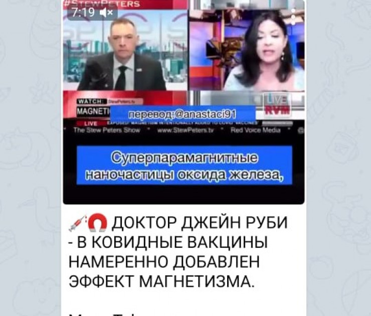 Портал Stopfake.kz продолжает развенчивать мифы вокруг вакцин против COVID-19. В Telegram-чатах казахстанцы вновь распространяют теорию о том, что в вакцинах содержатся магнитные частицы. На этот раз "доказательством" выступает видеоинтервью с доктором Джейн Руби, которая заявляет, что магнитные частицы необходимы для того, чтобы "проталкивать" мРНК из вакцин в клетки человеческого тела, передает Tengrinews.kz.