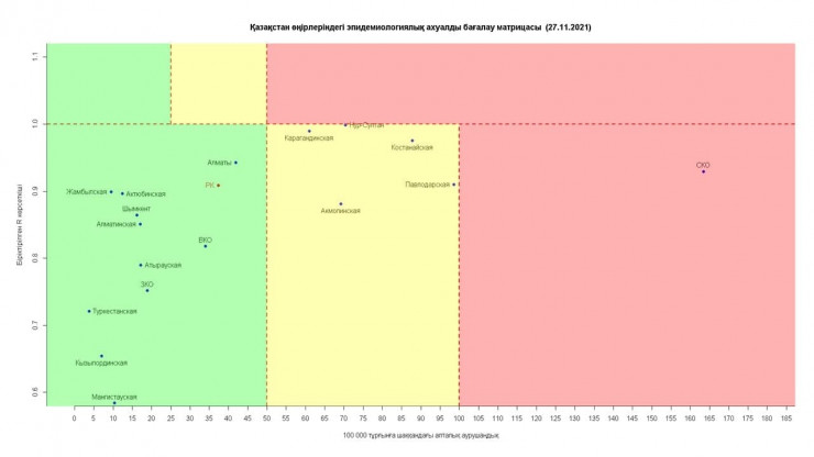 На утро 27 ноября матрица оценки эпидемиологической ситуации в регионах Казахстана выглядит так: