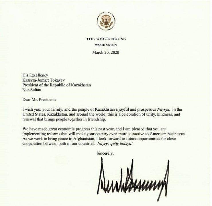 "Мы также работаем над установлением мира в Афганистане. Я намерен создать в будущем возможности для более тесного сотрудничества между двумя странами. Nayryz qutty bolsyn!" - говорится в письме Дональда Трампа.