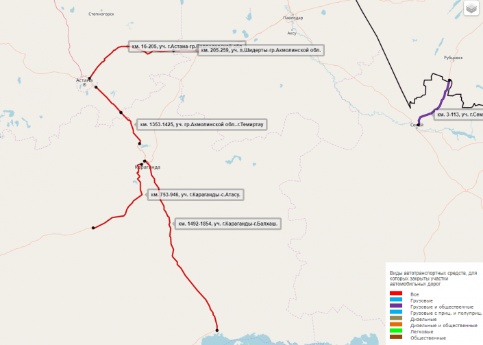 На участке дороги от города Семей до границы с Россией ограничено движение для грузового и общественного транспорта.