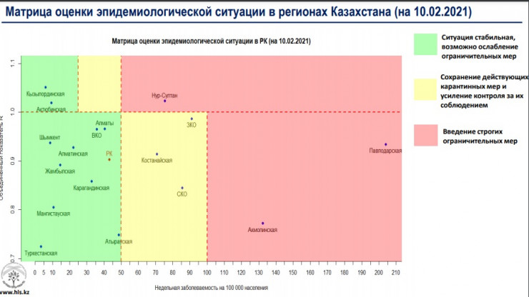 Согласно матрице оценки эпидемиологической ситуации в регионах Казахстана на 10 февраля, в "красной" зоне: Нур-Султан, Акмолинская, Павлодарская области.