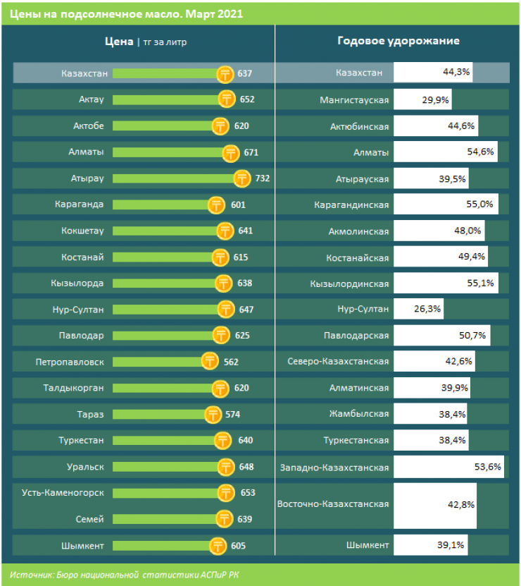 Дороже всего среди крупных городов страны подсолнечное масло стоило в Атырау: 732 тенге за литр. Высокие цены отмечены также в Алматы и Усть-Каменогорске. Дешевле всего масло стоило в Петропавловске: 562 тенге за литр.