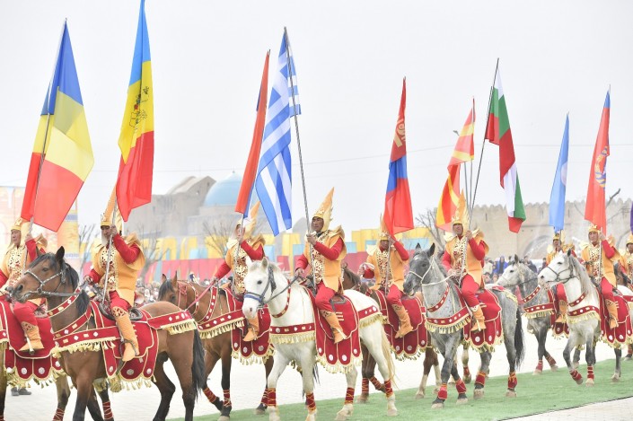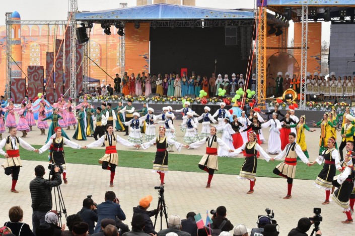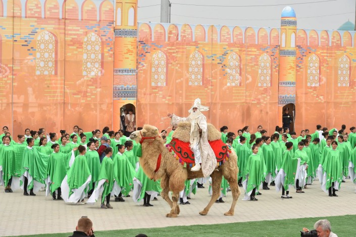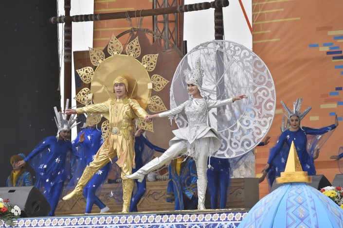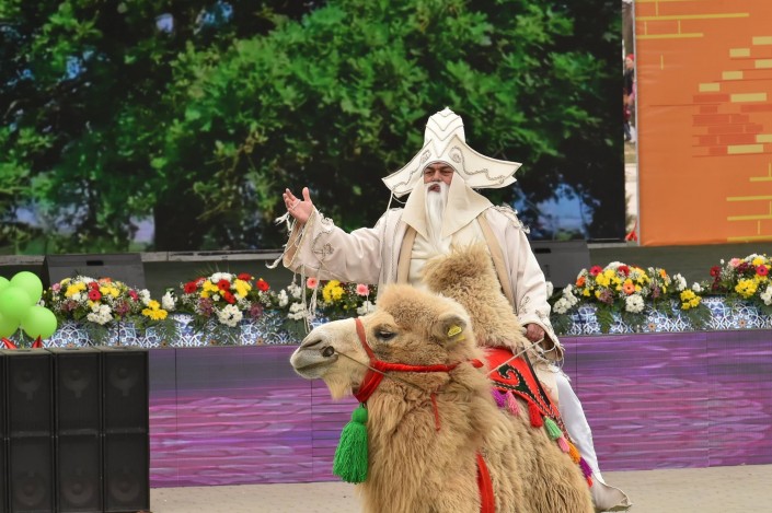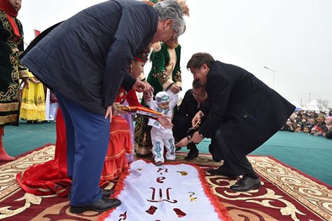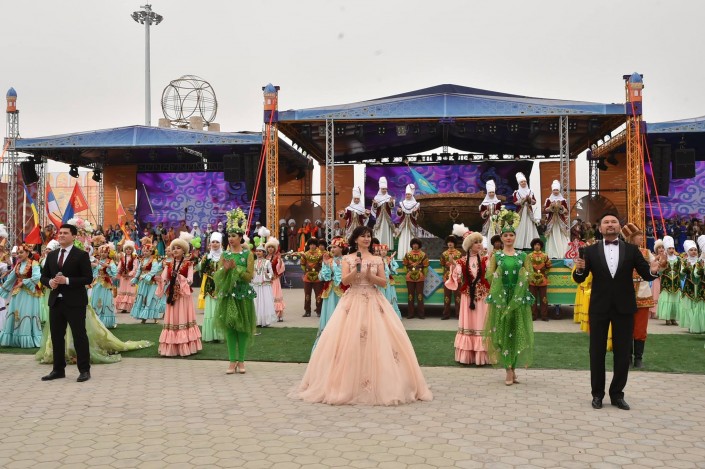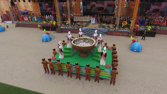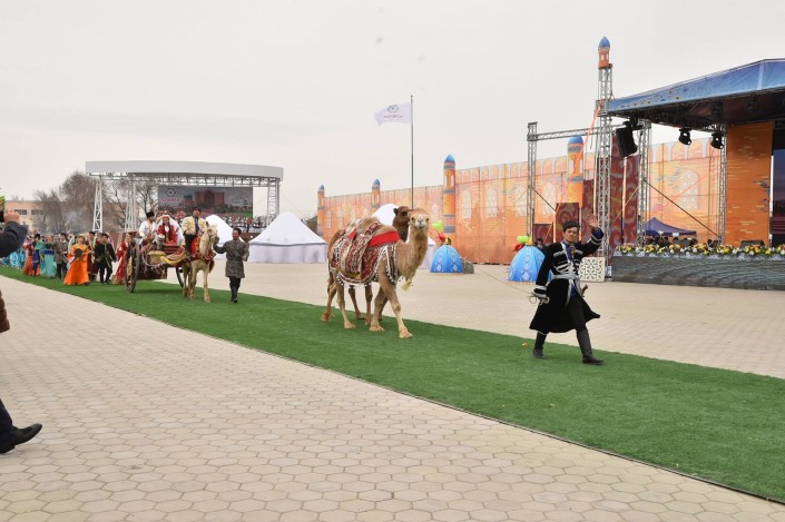 На сцене в это время развернулось  театральное представление. Актеры были в образах Арыстан баба, Яссауи, аль-Фараби, Коркыт Ата, казахских ханов, а около 500 танцоров удивили всех масштабной хореографической постановкой. Кроме того, по площади прошел караван "Наурыз" из 18 верблюдов и 30 лошадей. Затем в присутствии тысяч человек малышу из Туркестана провели обряд тусаукесу. Путы перерезали аким ЮКО Жансеит Туймебаев и министр культуры и спорта Арыстанбек Мухамедиулы.