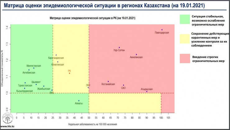 Напомним, по данным на 19 января, в "красной" зоне находятся Нур-Султан, Акмолинская, Атырауская, Костанайская, Павлодарская и Северо-Казахстанская области. В "желтой" зоне: Алматинская, Карагандинская и Западно-Казахстанская области. В "зеленой" зоне - все остальные регионы.