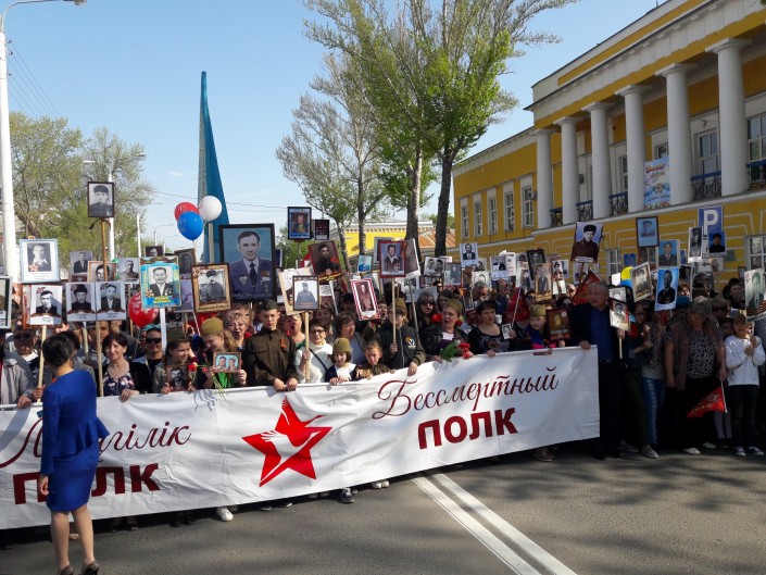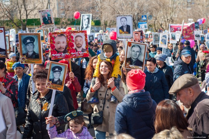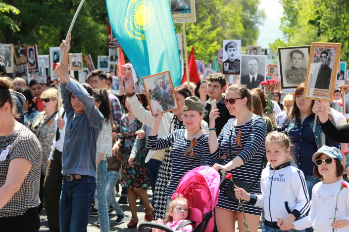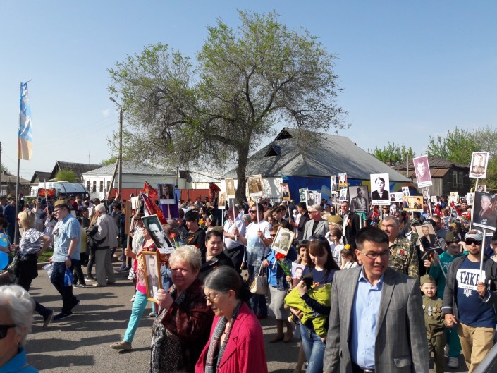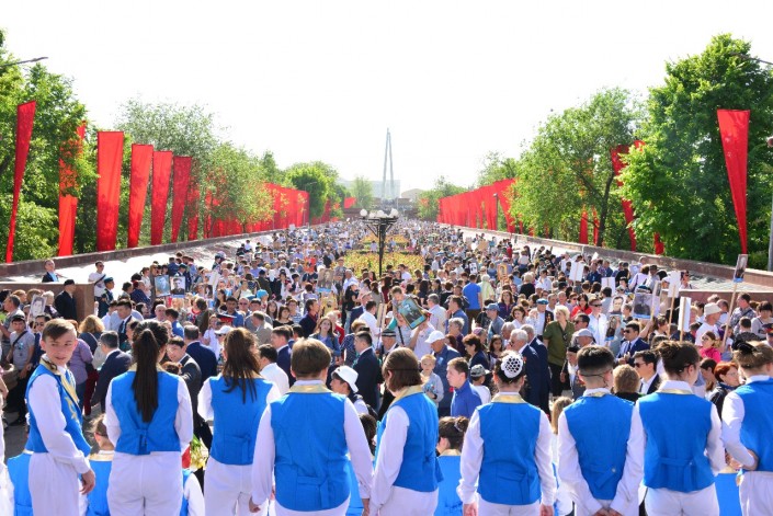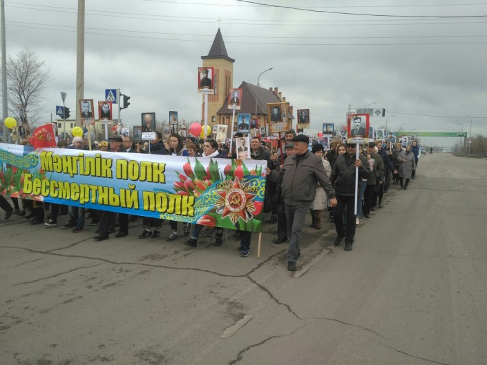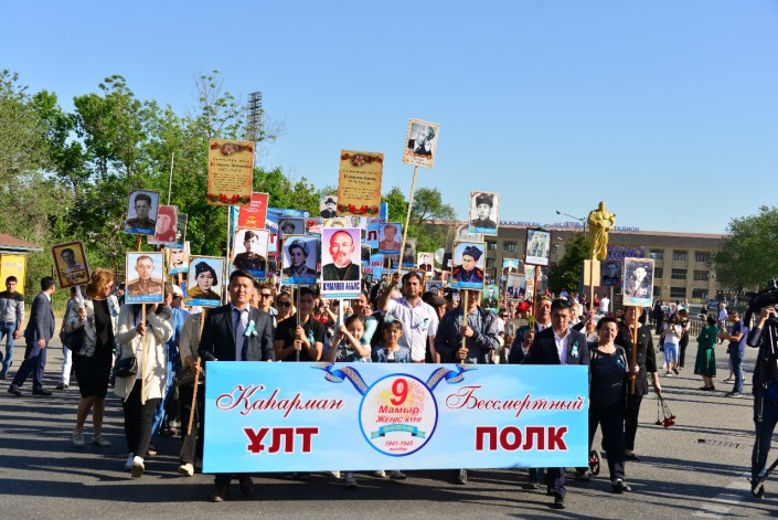 8 утра у памятника Кажимукану на Центральном стадионе начался сбор и построение колонны Бессмертного полка. В 8:45 началось движение колонны, которая прошла от Центрального стадиона до Мемориала Славы.
