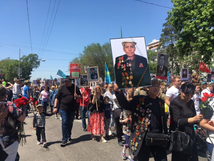 Возглавили колонну ретро-автомобили, далее шел БТР с флагом Казахстана, копией знамени Победы и знаменем "Бессмертного полка". Участники марша несли штандарты всех фронтов. Мелодии и песни военных лет звучали на протяжении всего маршрута.