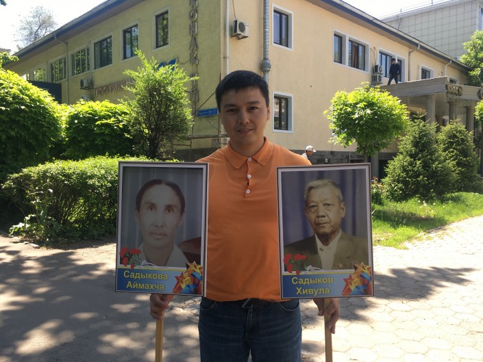 С портретами вышел и алматинец Сардаш Садыков. В акции "Бессмертный полк" он участвует четвертый год. Каждый раз выходит и чтит память своего деда Хивулы Садыкова.