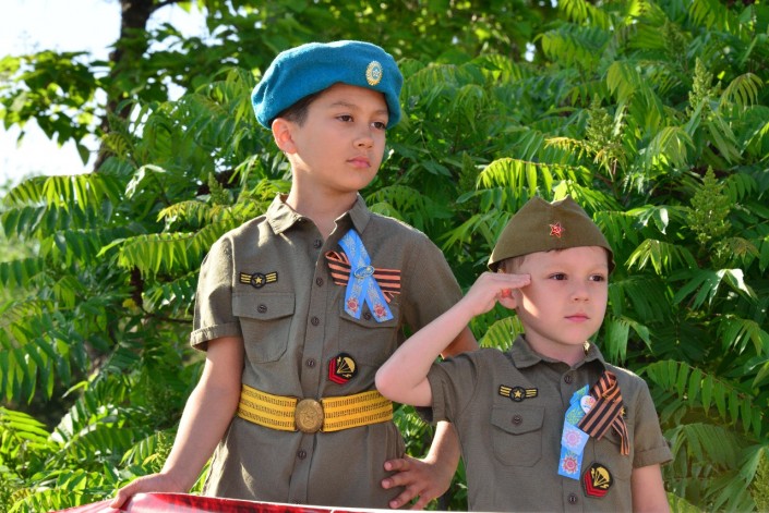 На улицы вышли очень много молодежи. Многие парни и девушки надели военную форму. Они с удовольствием фотографировались и пели песни военных лет.