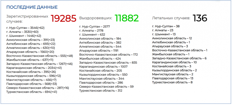 "В инфекционных стационарах получают лечение на данный момент 1398 пациентов, из них в крайне тяжелом состоянии - 19 человек, 173 - в тяжелом состоянии, 1044 - средней степени тяжести и 162 пациента в удовлетворительном состоянии. Пневмония диагностирована в 980 случаях, что составляет 70 процентов. Выписано за вчерашний день 149 человек, поступило 100", - пояснила Асель Бейсенбаева.
