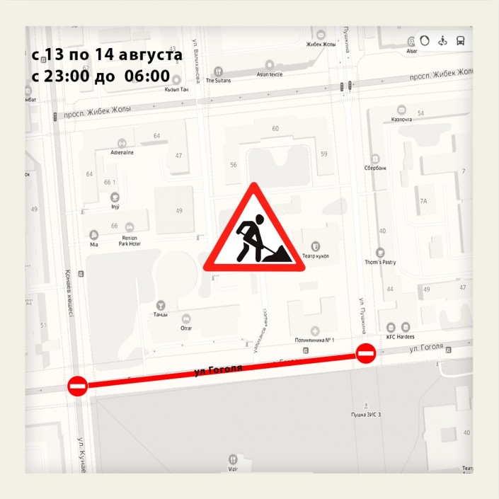 "В связи с дорожно-ремонтными работами на улице Гоголя от улицы Кунаева до улицы Пушкина данный участок с 13 августа 23.00 до 14 августа 6.00 будет перекрыт полностью. Во избежание заторов просим жителей и гостей города Алматы скорректировать свой маршрут заранее", - говорится в сообщении организации.