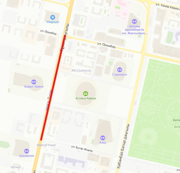 В связи с проведением ремонтных работ по проспекту Туран с 6 по 12 мая текущего года будет полностью перекрыто движение для автотранспортных средств на участке от улицы Бухар Жырау до улицы Орынбор (местный проезд в обе стороны).