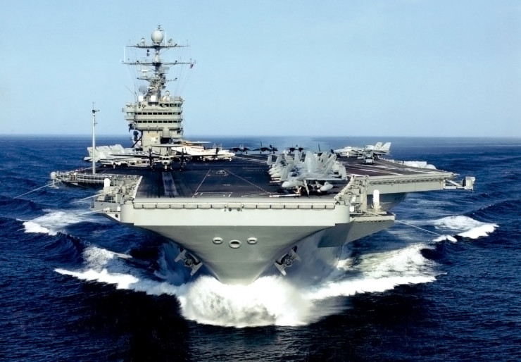 Один из 10 крупнейших авианосцев класса "Нимиц" с водоизмещением более 100 тысяч тонн (то есть масса воды, вытесненной подводной частью корпуса корабля, которая по сути равна массе всего корабля независимо от его размера, материала и формы).